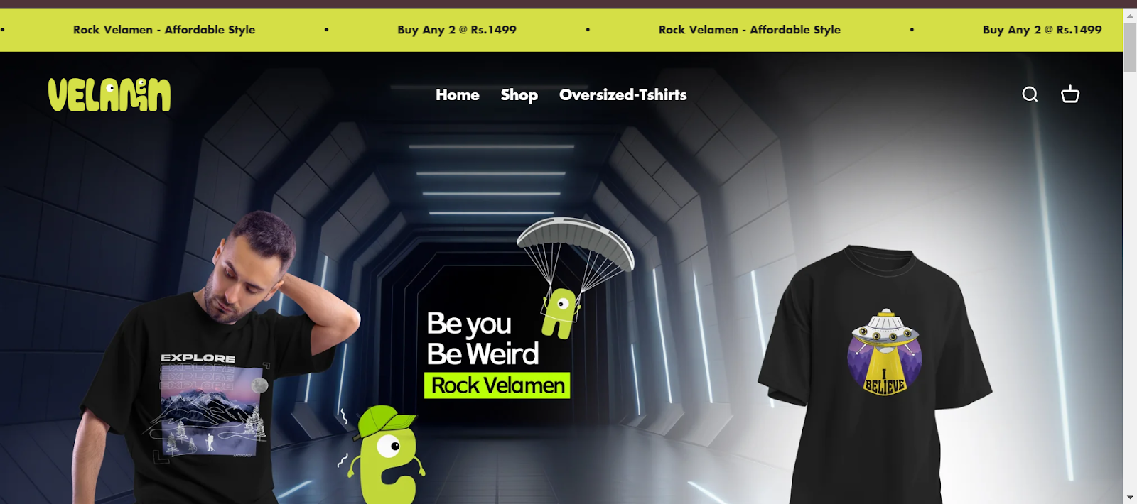 Homepage of the Velamen website featuring oversized t-shirts, with a model wearing a black 'Explore' shirt and another shirt with a UFO and 'I Believe' text. The background shows a futuristic corridor with a parachuting character and the slogan 'Be you, Be Weird, Rock Velamen'