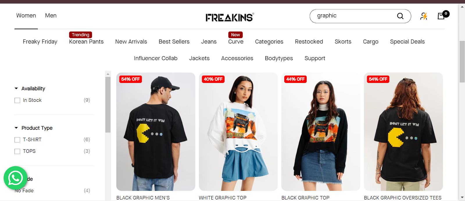 Image of the Freakins website displaying various graphic tops and tees on sale, including black and white graphic shirts with designs and discount labels