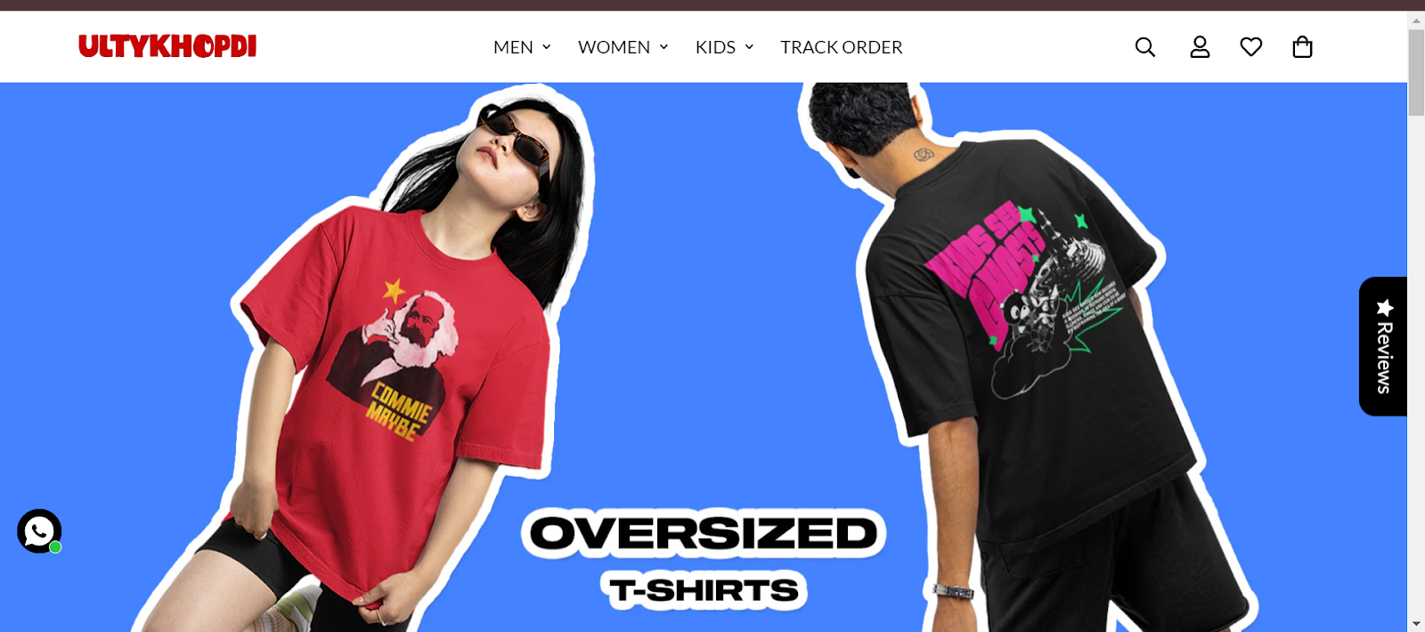 Homepage of Ultykhopdi website showcases oversized t-shirts, with one model wearing a red 'Commie Maybe' shirt and another wearing a black 'Kids See Ghosts' shirt against a blue background