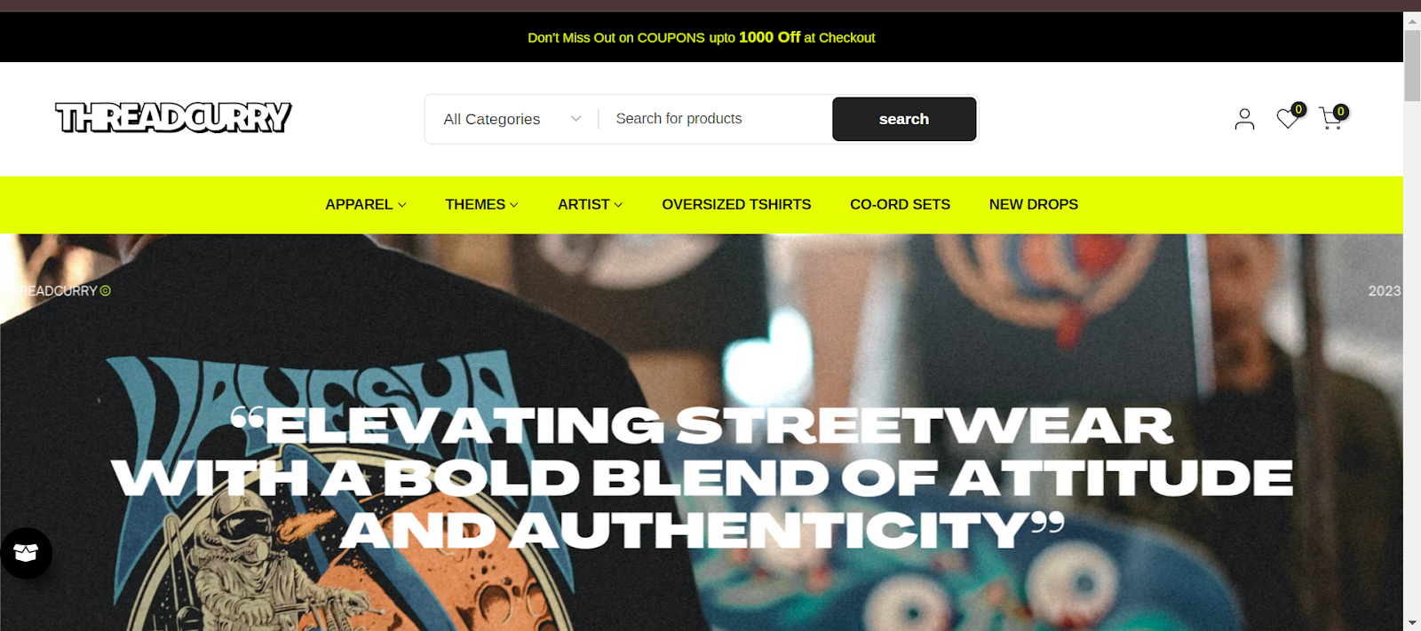 Homepage of ThreadCurry brand featuring graphic-oversized t-shirts for men and women in India