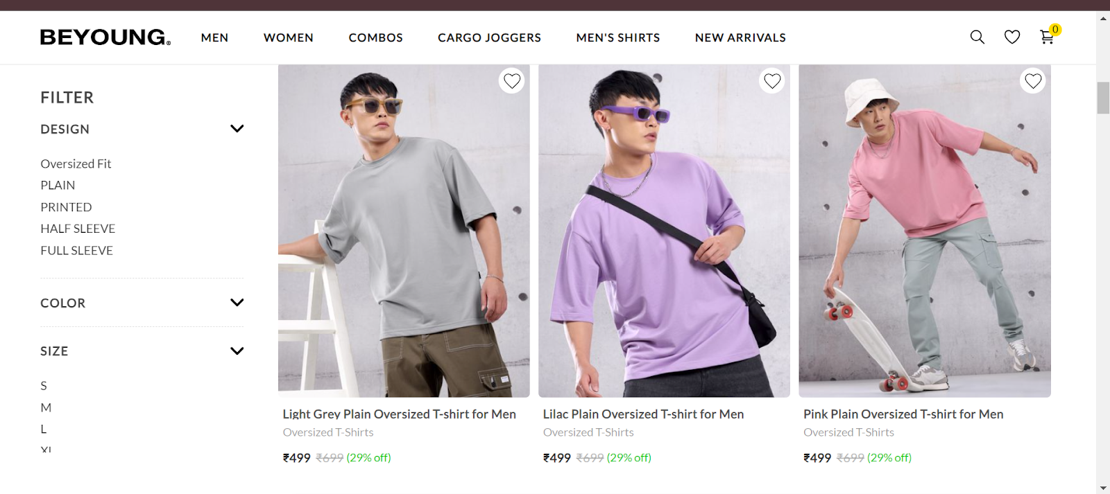 The D2C website of BeYoung brand features stylish collections of oversized t-shirts tailored for the Indian market.