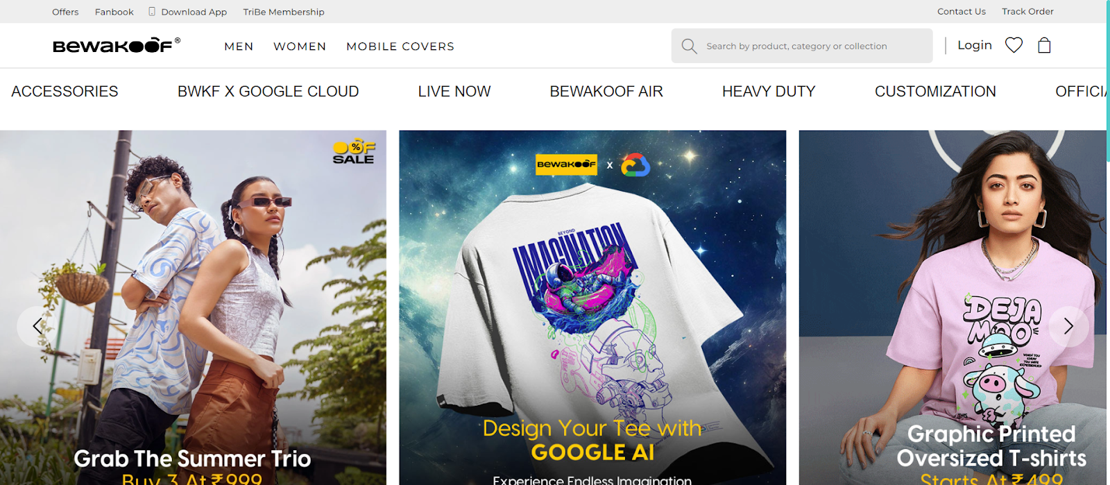 Homepage of Bewakoof brand featuring best-oversized t-shirts for men and women in India