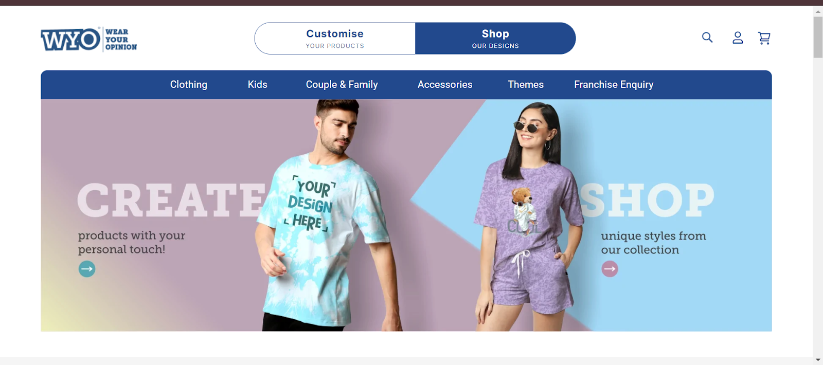 WYO (Wear Your Opinion) brand's homepage highlights the top oversized t-shirts for men and women in India