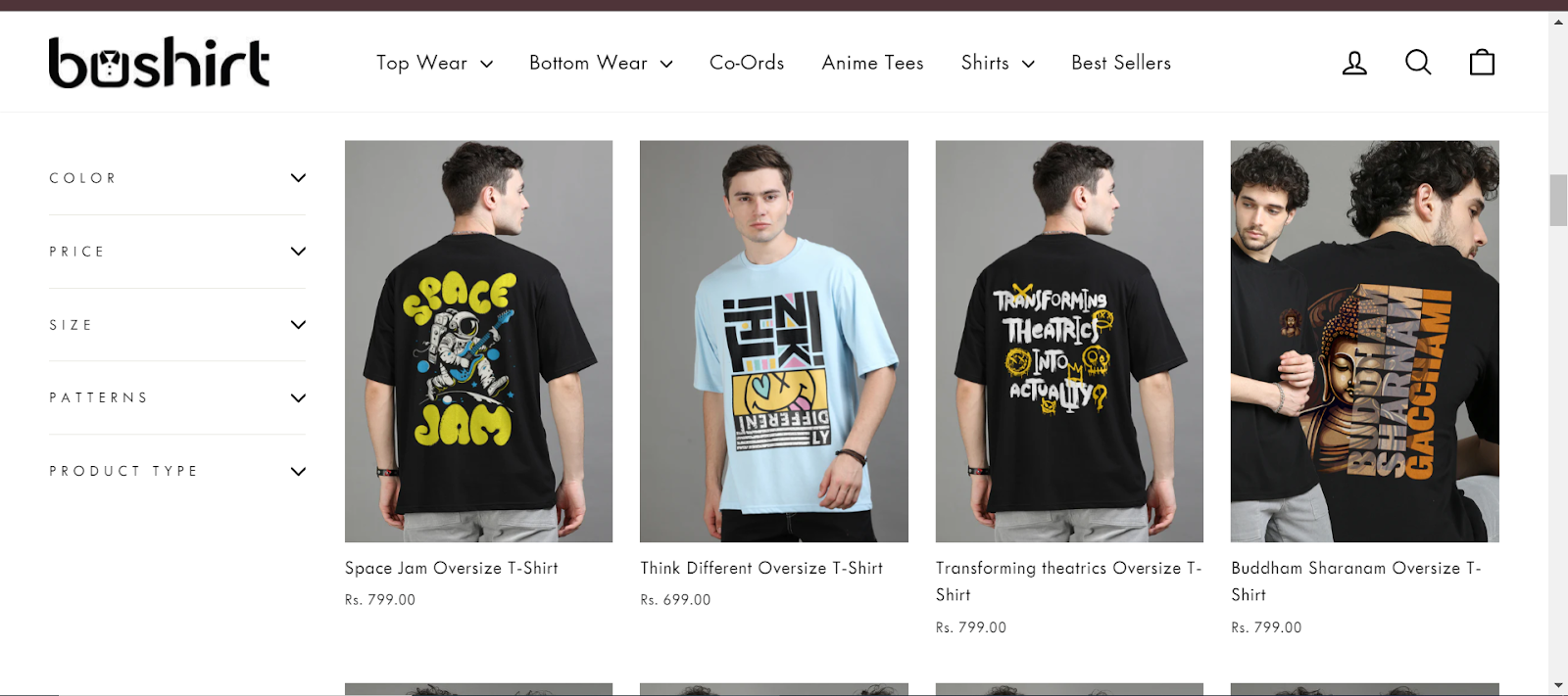 The D2C platform of Bushirt brand showcases fashionable collections of oversized t-shirts specifically designed for the Indian market.